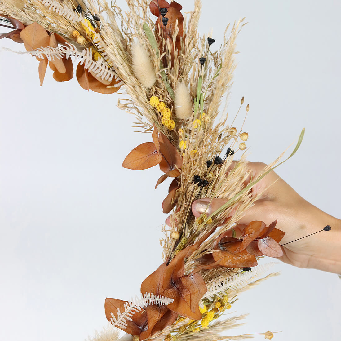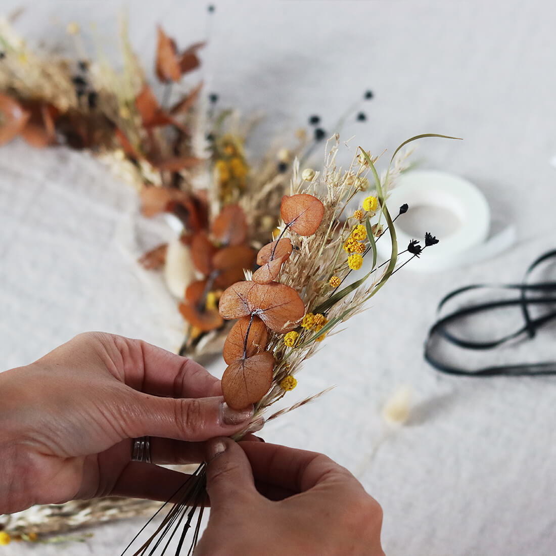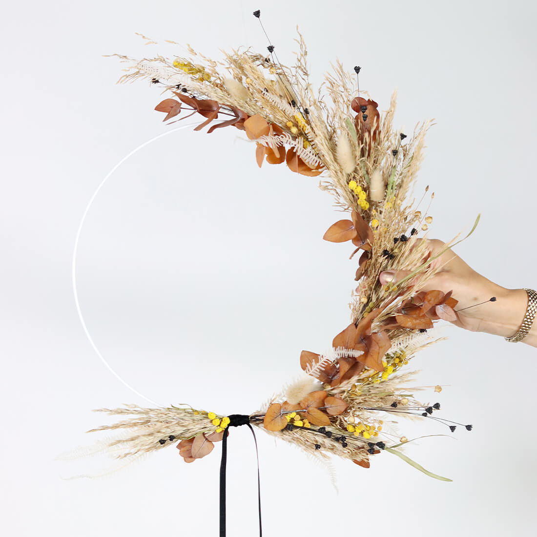 Warm sweaters, candlelight, crisp walks and sitting in front of the fire - we’re fully embracing autumn here at shida. Up the cosy factor with your own Scandinavian style indoor wreath using preserved foliage that won’t wilt. Beautiful preserved foliage in rich, autumnal hues punctuated with monochrome details will create a sense of hygge in your home. Simply follow our wreath making guide and use the floristry tape provided to attach small mixed bunches to the white wreath ring.