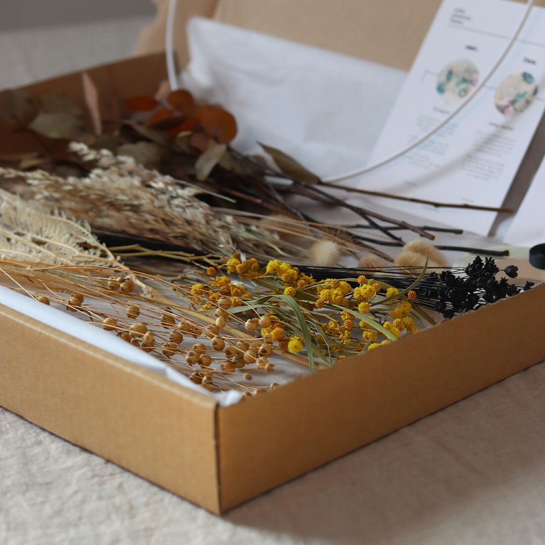Set includes, preserved foliage and flowers, 30cm white wreath ring, floristry tape, ribbon and instructions.